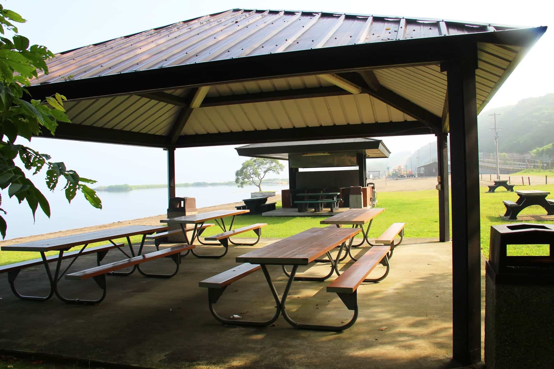 The small pavilion offers covered seating and grills to barbecue on. Located at the far left of the beach grounds, this is the most private area, with beautiful views of Lake Ogawara.