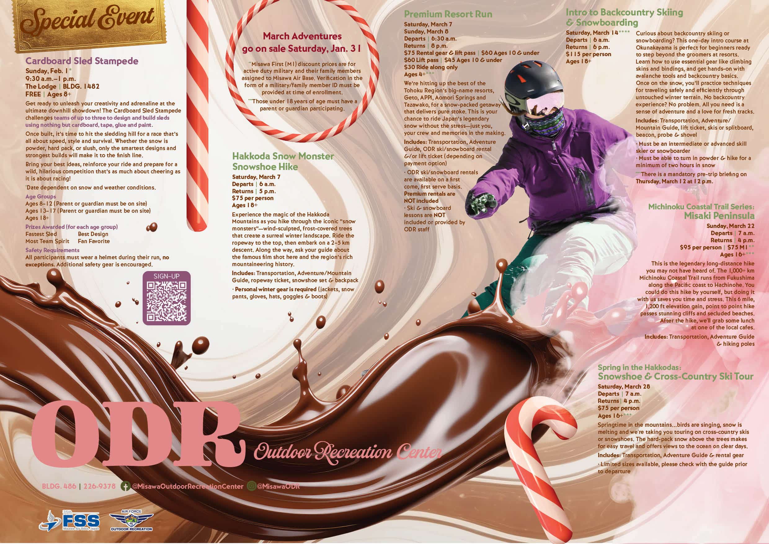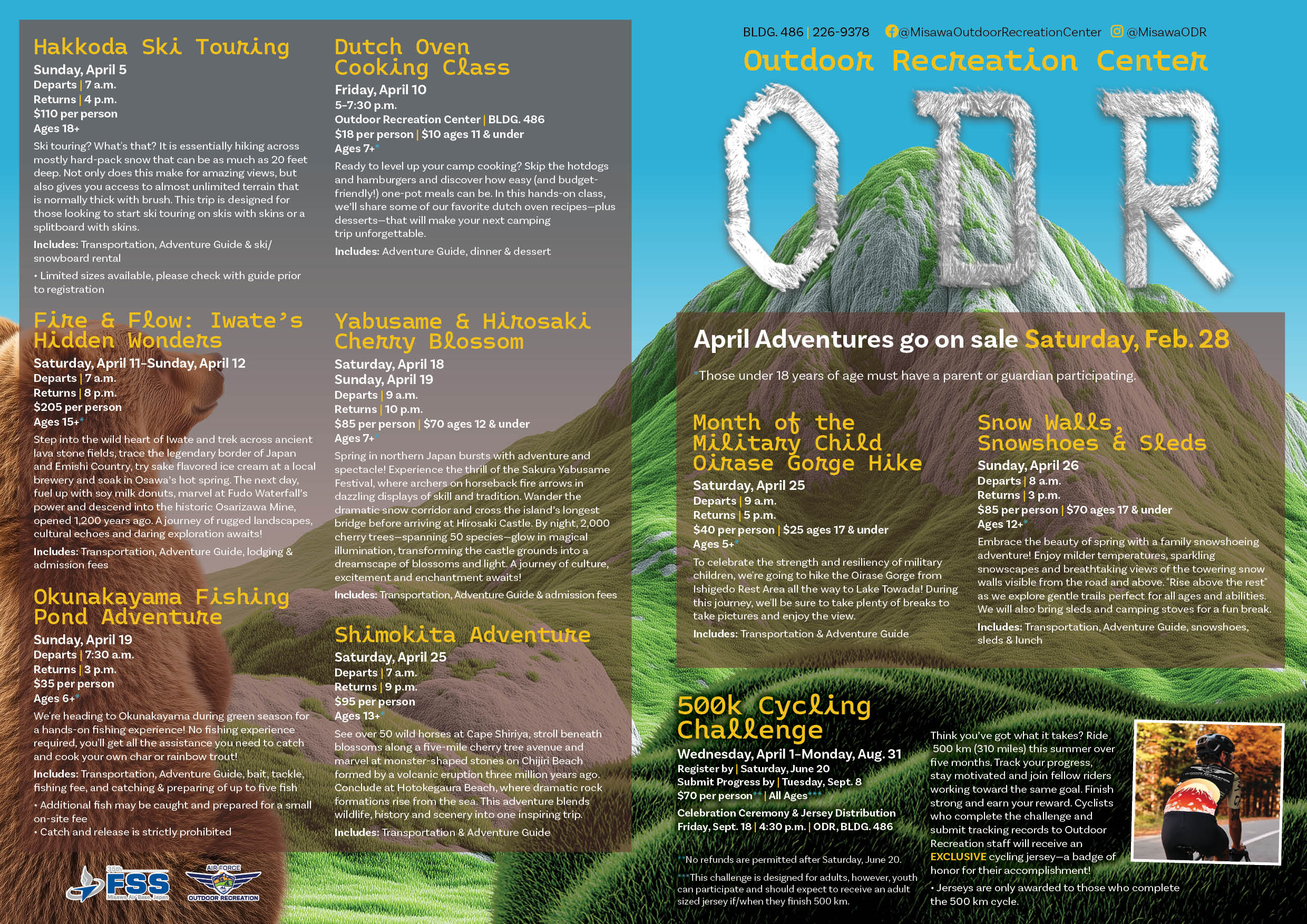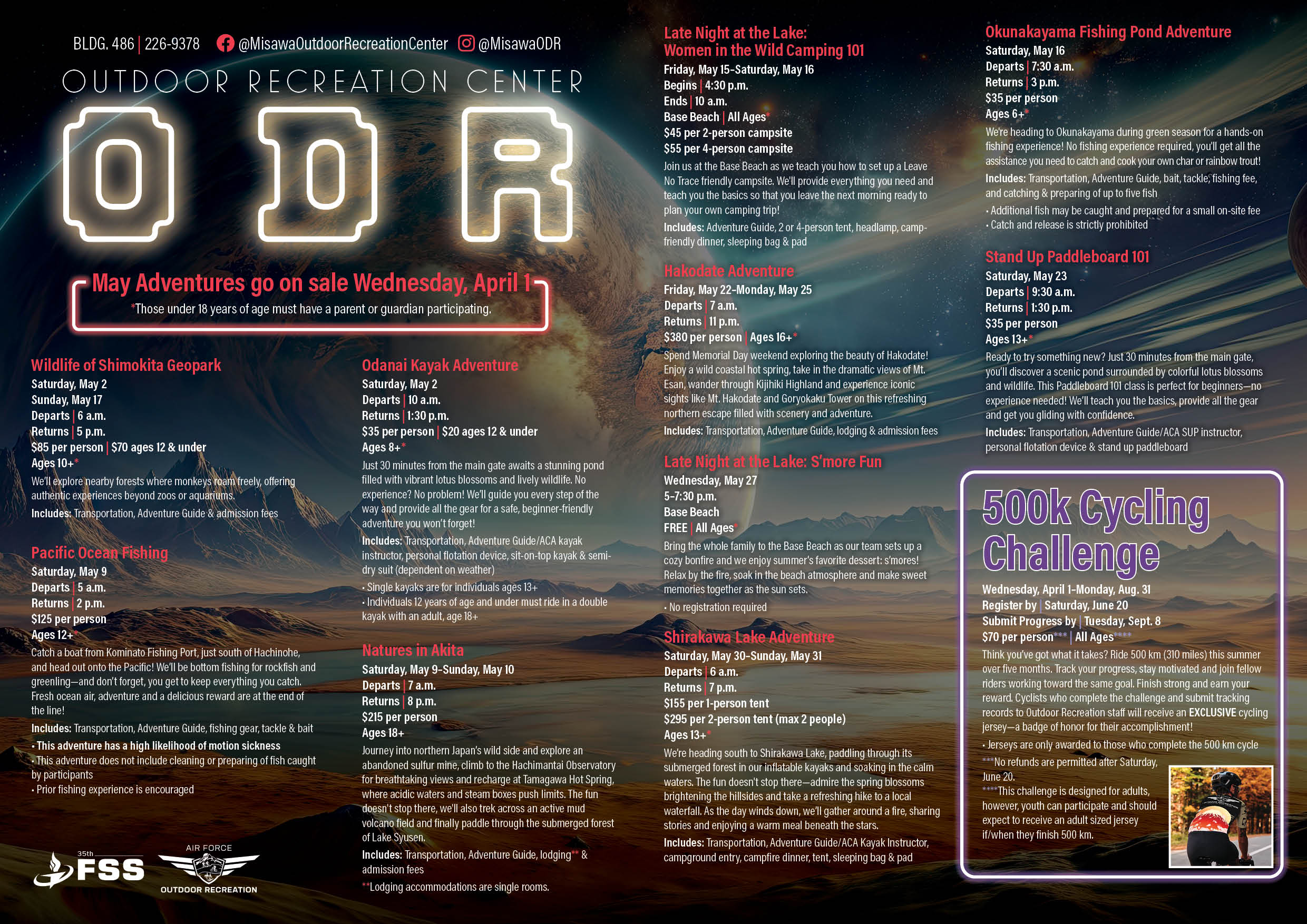 Outdoor Recreation has a number of facilities around base that will get you out and enjoying all the seasons in Misawa. Click on the links below to learn more about each one. Looking to venture off base? Scroll up for our trips!